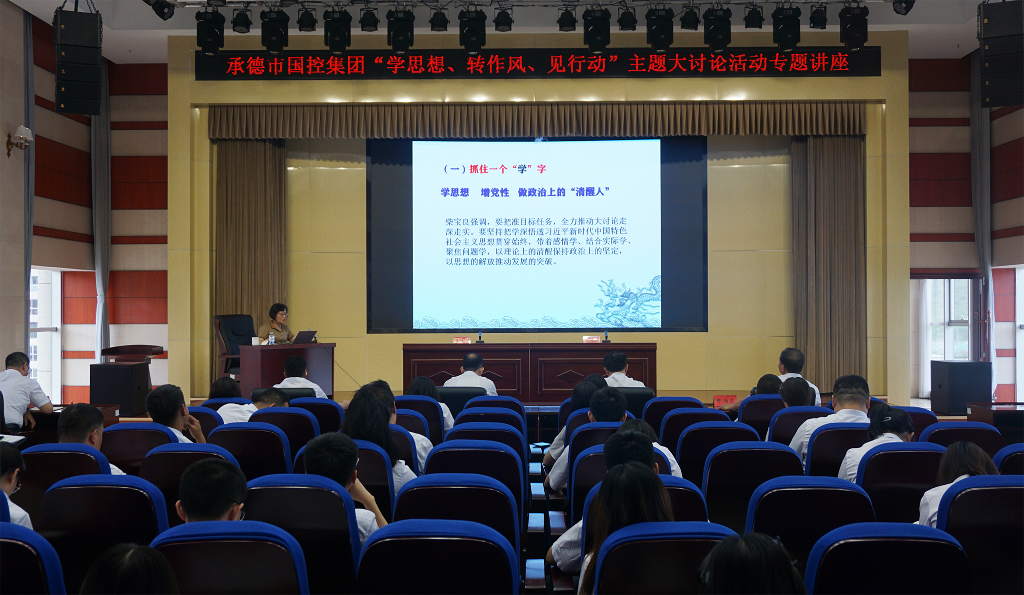 2023年7月6日,為深入學習貫徹習近平總書記關于堅持不懈抓好作風建設的重要論述,落實市委市政府關于在全市開展“學思想、轉作風、見行動”主題大討論活動精神,市國控集團邀請承德市委黨校黨史黨建教研室主任王仲娟教授,開展了“學思想、轉作風、見行動”主題大討論活動專題講座,市國控集團領導班子、集團本部全體員工、實際控制子公司中層以上負責同志及黨員員工參加講座。