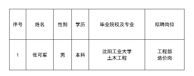 因公司發(fā)展需要,承德市國越房地產(chǎn)開發(fā)有限公司委托第三方機(jī)構(gòu)面向社會(huì)公開工程部造價(jià)崗員工1名?,F(xiàn)對(duì)擬錄用人員信息進(jìn)行公示,公示期間如有異議,可通過電話、信函等方式反映,反映意見請(qǐng)署真實(shí)姓名。