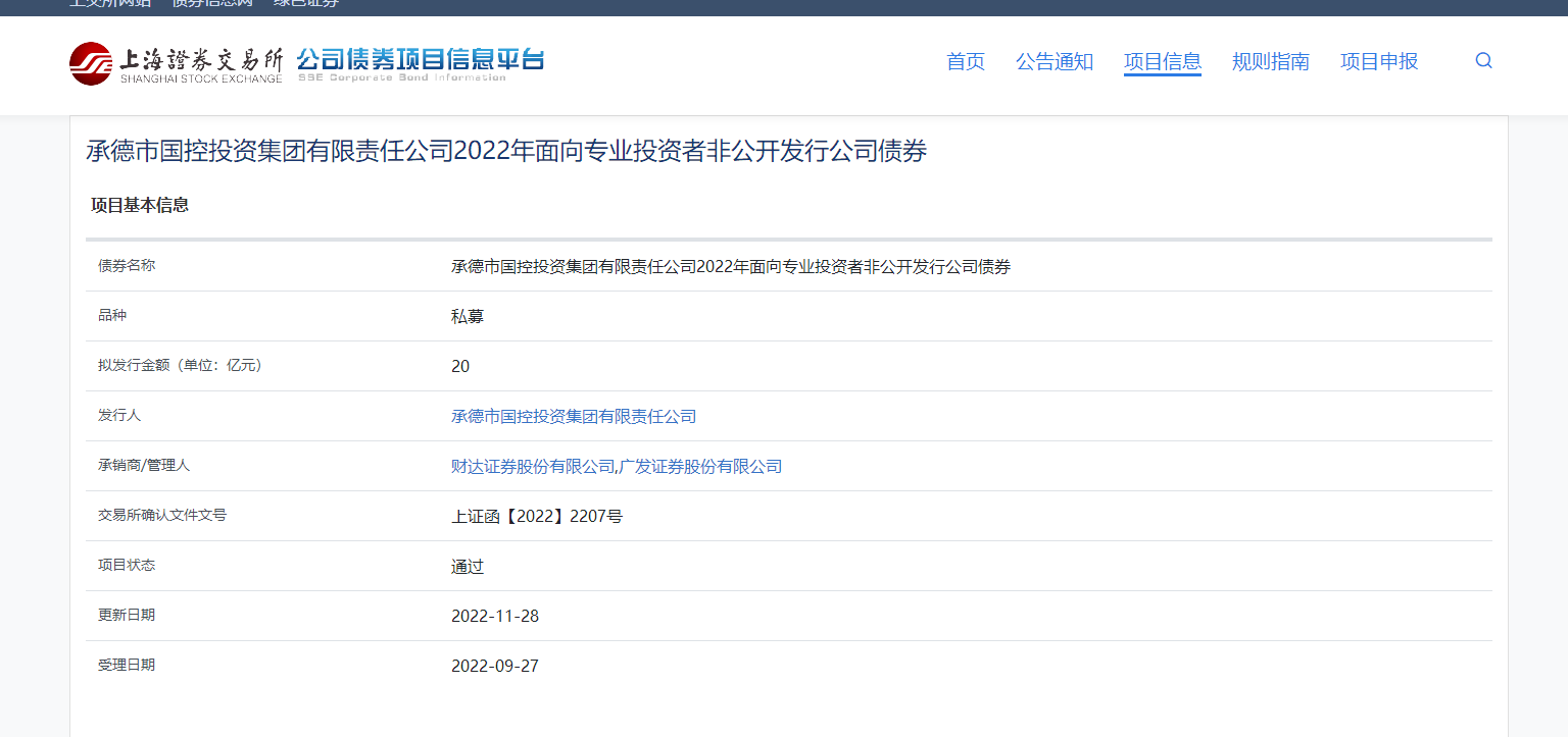 11月29日,集團公司收到上交所《關(guān)于對承德市國控投資集團有限責任公司非公司發(fā)行公司債券掛牌轉(zhuǎn)讓無異議的函》,同意市國控集團非公開發(fā)行20億元公司債券,專項用于償還“20承控01”公司債券等到期債務(wù)。